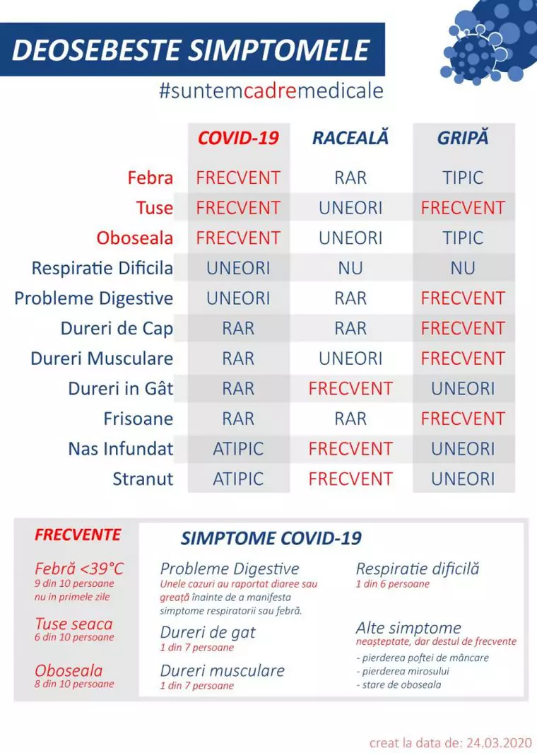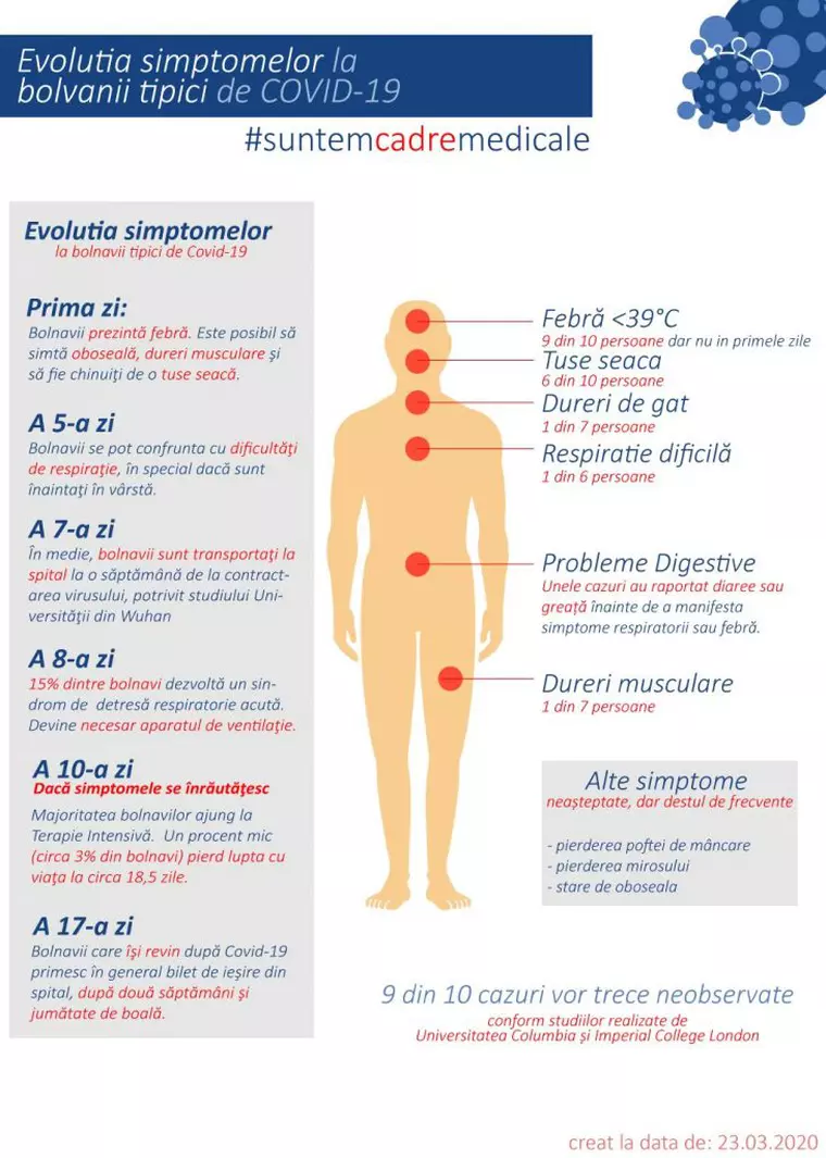 Un grup de medici români a realizat un material despre evoluția simptomelor la bonavii de COVID-19, prezentând schematizat modul în care avansează boala din prima și până în a 17-a zi, când intervine vindecarea, dar și diferențele dintre gripa comună și coronavirus, detalii care vin în ajutorul celor care suspicionează că s-au infectat.