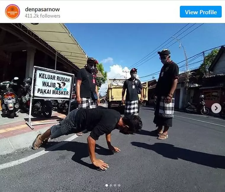Conform Daily Star, dar și mărturiei unor locuitori, precum și a imaginilor sugestive care circulă pe Internet, polițiștii din Bali au ales o metodă inedită de a-i sancționa pe cei ce nu poartă masca de protecție în public: câteva zeci de flotări ori alte exerciții fizice, în funcție de imaginația polițistului în cauză.
