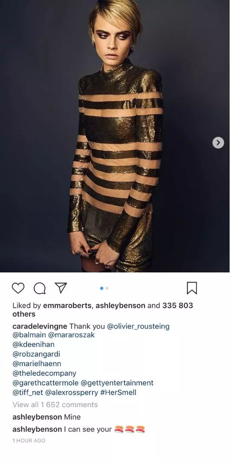 Iar replică, Delevingne a comentat la cea din urmă postare pe instagram a lui Benson, confirmând, la rândul ei, relația. Delevingne și Benson au mers împreună la International Film Festival de la Toronto și s-au lăsat fotografiate.