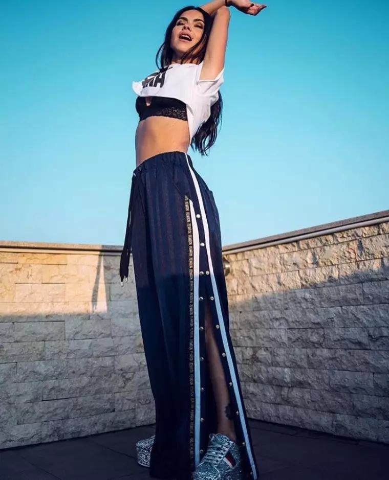 Inna a dus în zona casual sclipitorii sneakersi, purtându-i la o pereche de pantaloni sport cu capse, o bustieră şi un t-shirt foarte scurt. Deşi platformele sunt destul de încărcate, Inna a reuşit să echilibreze perfect outfit-ul.