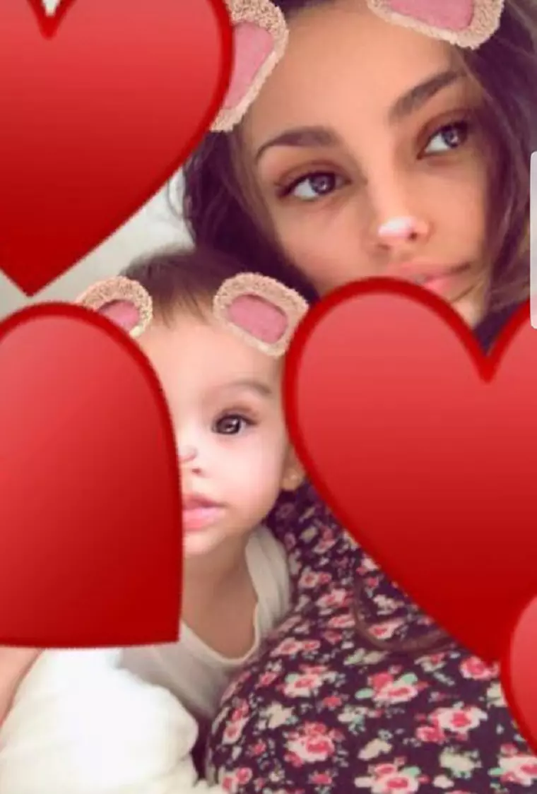 În fotografie, Mădălina Ghenea îşi ţine micuţa în braţe, la piept, ambele având urechiuşe de ursuleţ, un efect special al aplicaţiei.