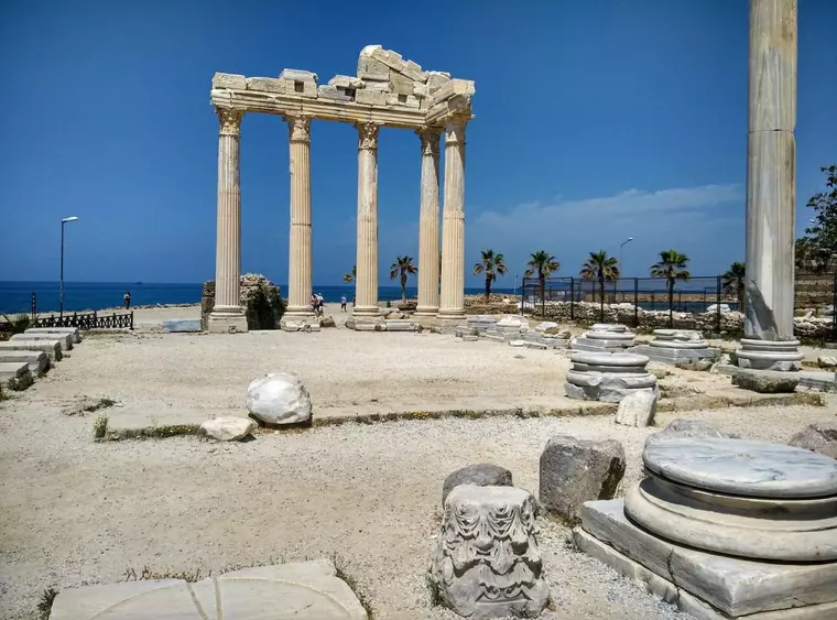 Centrul vechi este un adevărat muzeu în aer liber cu străduțe înguste pietruite, grădini de portocali și rodii, magazine boeme și restaurante cu specific turcesc. Side găzduiește unele dintre cele mai bine conservate monumente din Antalya. Dintre acestea se numără Templele din marmură ale lui Apollo și Atenei care se remarcau prin coloanele corintice impozante și bogăția decorațiunilor exterioare.