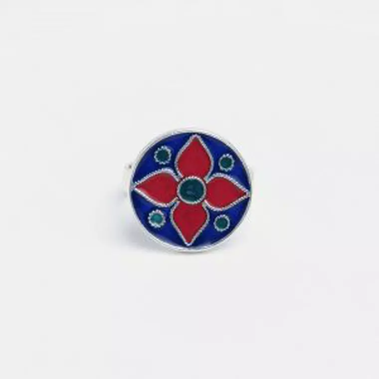Sub forma unui cerculeț decorat frumos cu floricele din filigran, un inel din argint colorat cu accente verzi, albastre și roșii, din email, va deveni accesoriul tău preferat.