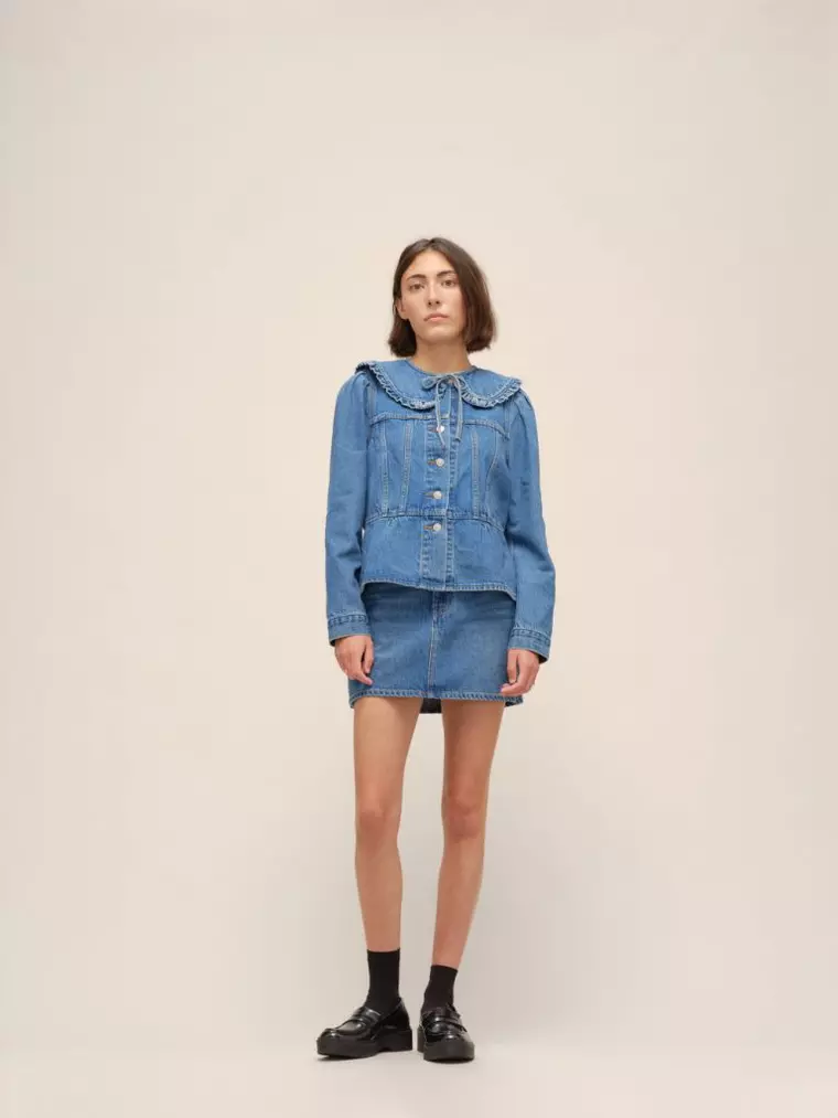 Nu în ultimul rând, 70s High Micro Mini, este o mini-fustă din denim inspirată din anii 1970, care prezintă o talie super înaltă cu fermoar si un croi scurt, subțire, care se termină deasupra genunchiului.