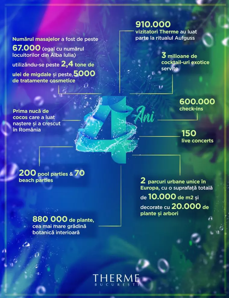 Trei milioane de români, adică aproape 1 din 5 români care locuiesc în țară, și un milion de turiști străini au vizitat Therme în cei patru ani de la deschiderea complexului termal din nordul Bucureștiului. Capitala este astfel, de 4 ani, pe harta europeană și mondială a turismului de wellness și relaxare.
