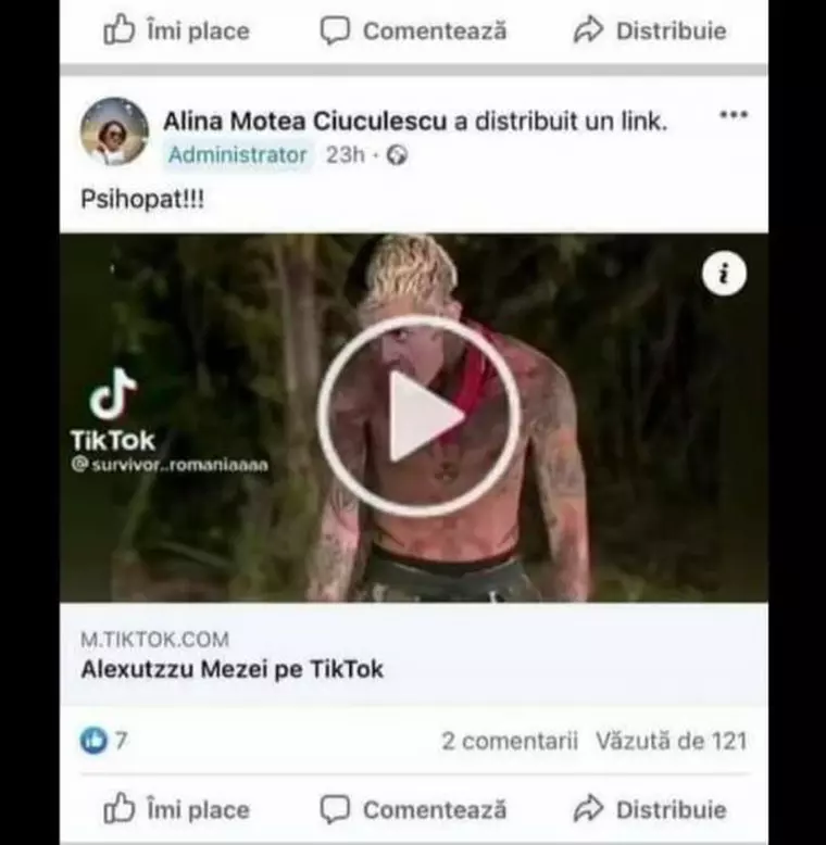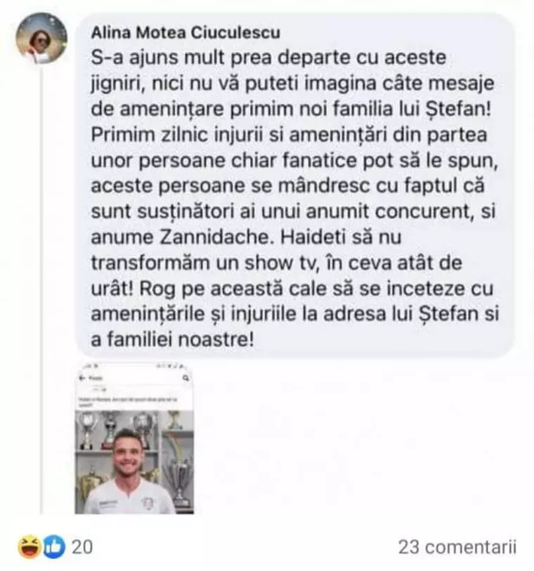 „M-am amuzat copios la toate comentariile pro/ contra crezând ca totul are o limita a bunului simt, dar m-am înșelat amarnic. Trăim într-o societate în care valorile reale (indiferent de ocupația pe care si-au ales-o) nu mai sunt apreciate, iar oamenii te judecă în fel și chip. Până aici totul e asumat, dar când vezi că mulți sunt mult prea pătimași în acest joc și o iau prea în serios este o problemă', a scris Alina Ciuculescu.