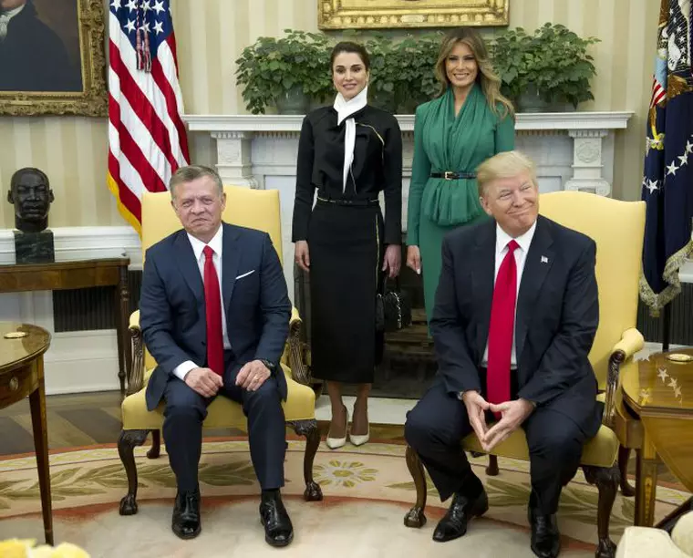 Fotografia zilei ne este furnizată cu ocazia vizitei Regelui Abdullah al II-lea al Iordaniei în Statele Unite, acesta fiind primul lider arab care s-a întâlnit cu Administrația Trump. Cât de fructuoasă a fost, de fapt, întâlnirea cu actualul președinte american nu vom afla probabil niciodată în totalitate, în schimb nu am putut rămâne indiferenți în fața superbelor consoarte ale celor doi oameni de stat: Melania Trump și Regina Rania. Regina și Prima Doamnă, ambele în vârstă de 46 ani, elegante și distinse, păreau să formeze un cuplu mult mai interesant decât partenerii lor de viață, pentru că au fost urmărite peste tot de camerele de luat vederi.
