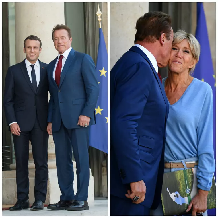 Întâlnirea dintre Schwarzie și Emmanuel Macron a stârnit parcă și mai mult interes decât încălzirea globală, cei doi făcând deliciul presei, însă de departe cel mai fotografiat moment a fost cel în care actorul a sărutat-o pe obraz pe Prima Doamnă a Franței. Nu știm dacă Brigitte Macron a fost luată prin surprindere de acest gest ce contravine total protocolului, cert e că, după câte se vede, pare chiar încântată de atenția pe care i-o acordă Mr. Universe, chiar dacă are un soț cu 30 de ani mai tânăr ca domnul cu mușchi din fotografie.