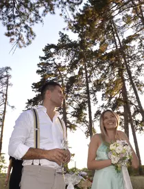 „Am ales sa ne cununam in aer liber, alaturi de familie. Pe aleea dintre brazi a conacului Polizu, am aranjat un living cu mobila veche. Quartet-ul ne-a insotit cu sunetul lui la tot pasul, soarele ne-a colorat la apus, iar cei dragi ne-au intampinat cu zambete si lacrimi in ochi. Cata emotie…!”