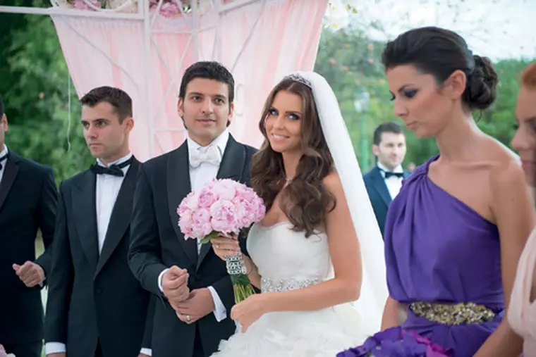 Pe pajistea Palatului Snagov, intr-un foisor din fier forjat alb, decorat cu trandafiri, Cristina Sucu s-a casatorit cu Vlad Alexandru Ciocarlan. Mezina Cameliei Sucu si-a dorit o nunta de poveste si a ales o rochie de mireasa cu trena lunga si trandafiri aplicati, semnata de Vera Wang, la care a asortat un buchet din bujori roz. Domnisoarele de onoare au purtat rochii create de Maria Lucia Hohan.