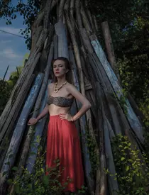 Ne-a placut un cadru foarte mult si apoi m-am gandit ca ar fi si mai interesant sa apelez la un outfit cu buget redus. Cea mai mare satisfactie a mea este sa gasesc o fusta misto cu paiete intr-un second hand. Dar nici in second hand nu imi place sa o gasesc pe umeras. Eu vreau sa ma lupt, sa ma catar pe maldarere de boarfe, sa scormonesc, sa ma ingrop in texturi si ca un cautator de comori, sa gasesc cufarul. Abia atunci sunt multumita. Si la fiecare vizita facuta parintilor mei, intorc pe dos dulapul fermecat si fac razboi in pod. Pe scurt, fusta e cumparata dintr-un targ, sandalele au fost ale mele si le-am trimis la bunici acum 8 ani. Le cumparasem din prima mea vacanta peste hotare. Grecia. Colierul e la noi in casa de cand eu nici nu ma nascusem. Bustiera e noua iar plasa leopard e cumparata de la magazinul din sat si am dat pe ea cinci ron', povesteste Adela Popescu pe blogul ei www.adelapopescu.eu