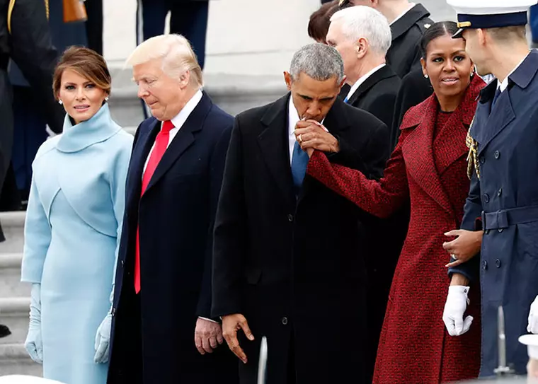 Comentariul psihologului: Imaginea aceasta arată clar două stiluri distincte de relații, una bazată pe atașament afectiv, cea a soților Obama, și una bazată pe interese comune, cea a soților Trump. Sunt două viziuni diferite de interacțiune umană, ambele având și plusuri, și minusuri. Obama pleacă privirea, sărută mâna soției pentru a își manifesta aprecierea față de Michelle, dar un motiv alternativ ar putea fi ignorarea prezenței lui Trump și tratarea lui cu spatele'. Nu este un gest protocolar. Cu toate acestea, Melania privește admirativ gestul lui Barack Obama, în timp ce Donald are privirea orientată înainte, către următorii 4 ani la Casa Albă, acesta fiind scopul cel mai important pentru el'.