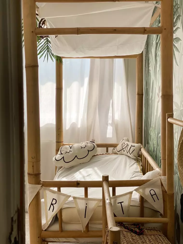 Pentru patul Ritei (2 ani), Laura a renunțat la ideea inițială, a unui ansamblu cu căsuță, și a ales o variantă care să le amintească de Bali.